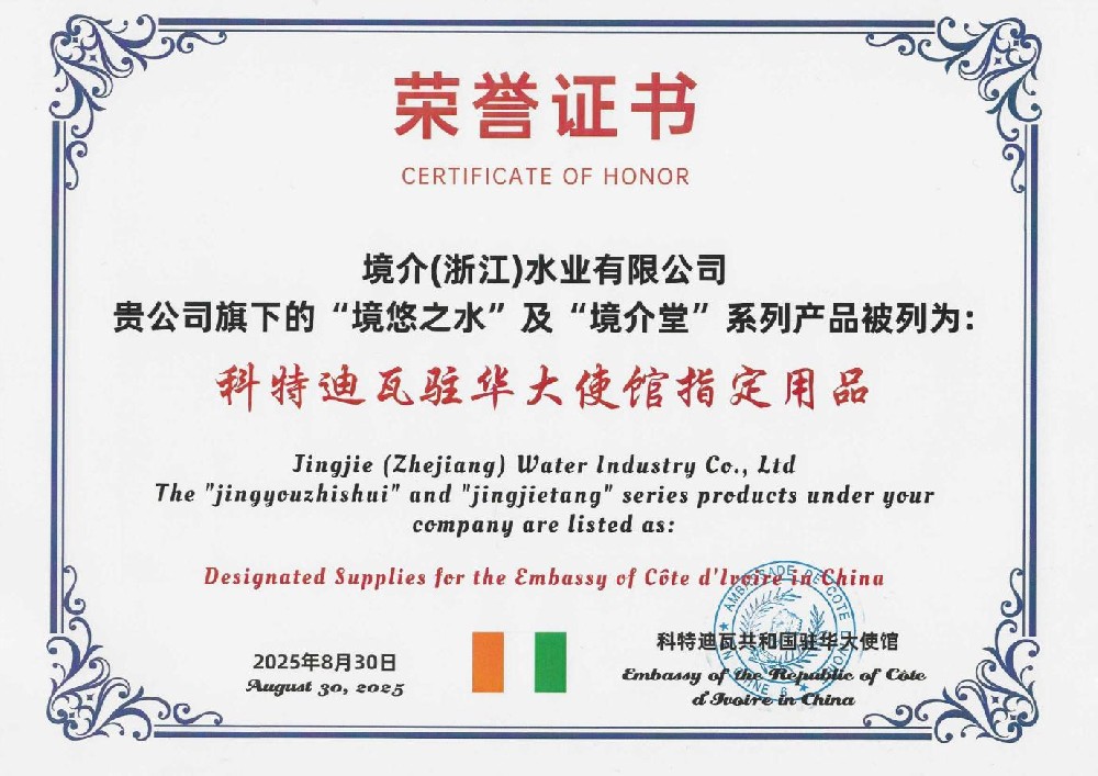 2025 年 8 月 30 日,北京,科特迪瓦共和国驻华大使馆在北京举行授证仪式,正式授予境介(浙江)水业有限公司旗下 “境悠之水” 与 “境介堂” 系列产品 “指定用品” 资质。这是继赤道几内亚、尼日利亚、利比亚、马达加斯加之后,品牌在短时间内第五次获得非洲国家驻华使馆官方认证,不仅印证了中国健康科技产品的国际竞争力,更成为中非在 “健康领域” 深化务实合作的新注脚,为中国原创健康方案融入非洲市场提供了可复制的实践路径。